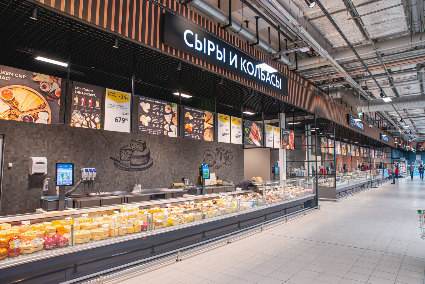 Торговая площадь гипермаркета, составляющая 5215 кв. м, оформлена в соответствии с обновленной концепцией. Группа внедрила ее в 2020 г. и продолжает придерживаться ее принципов при планомерной модернизации своих магазинов, а также при открытии новых торговых точек.