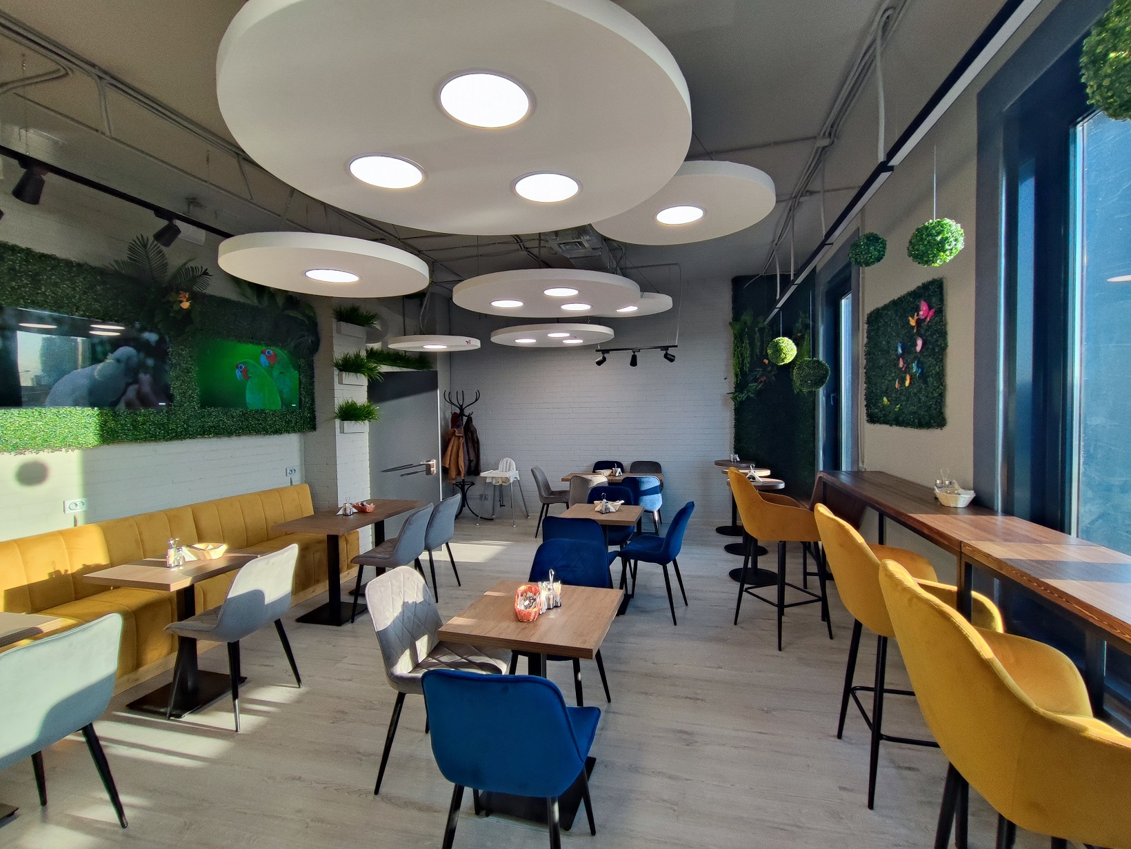 Ресторан представляет собой проект в стиле лофт. В интерьере использована лаконичная мебель спокойных оттенков. Уютную атмосферу дополняет приятная музыка и трансляция кадров природы на телевизионных экранах.