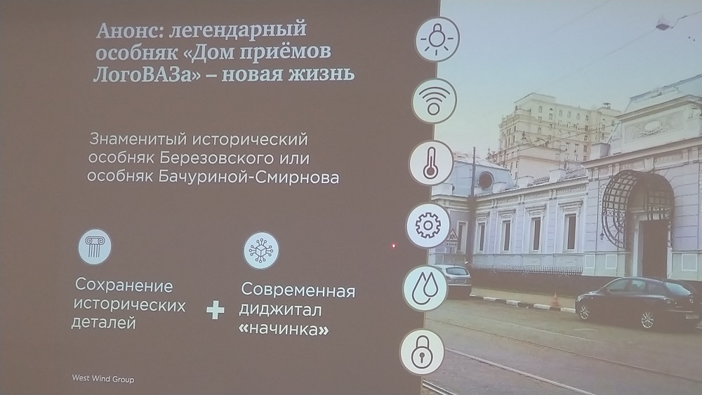 «Особняк является памятником архитектуры. Для нас важно сберечь и восстановить детали интерьера: шелковые обои в четырех кабинетах, мраморную лестницу с колоннами, паркет, лепнину и расписной потолок, печное отопление в кабинетах и облицовку каминов», — отметила Елизавета Ильюхина, руководитель коммерческого департамента West Wind Group.