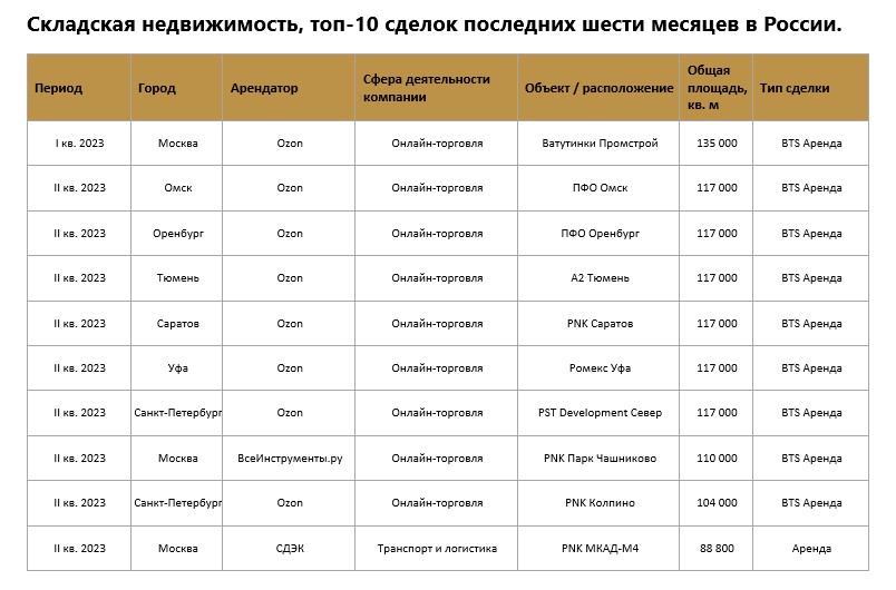 В сегменте складской недвижимости крупнейшими стали сделки купли-продажи логистических комплексов FM Logistic Дмитров и KazanExpress. Интересным фактом является то, что обе транзакции были реализованы по схеме sale-leaseback (продажа недвижимости с обратной долгосрочной арендой). Подобный формат позволяет собственнику не только сохранить за собой занимаемые ранее площади, но и высвободить капитал на другие направления деятельности.
