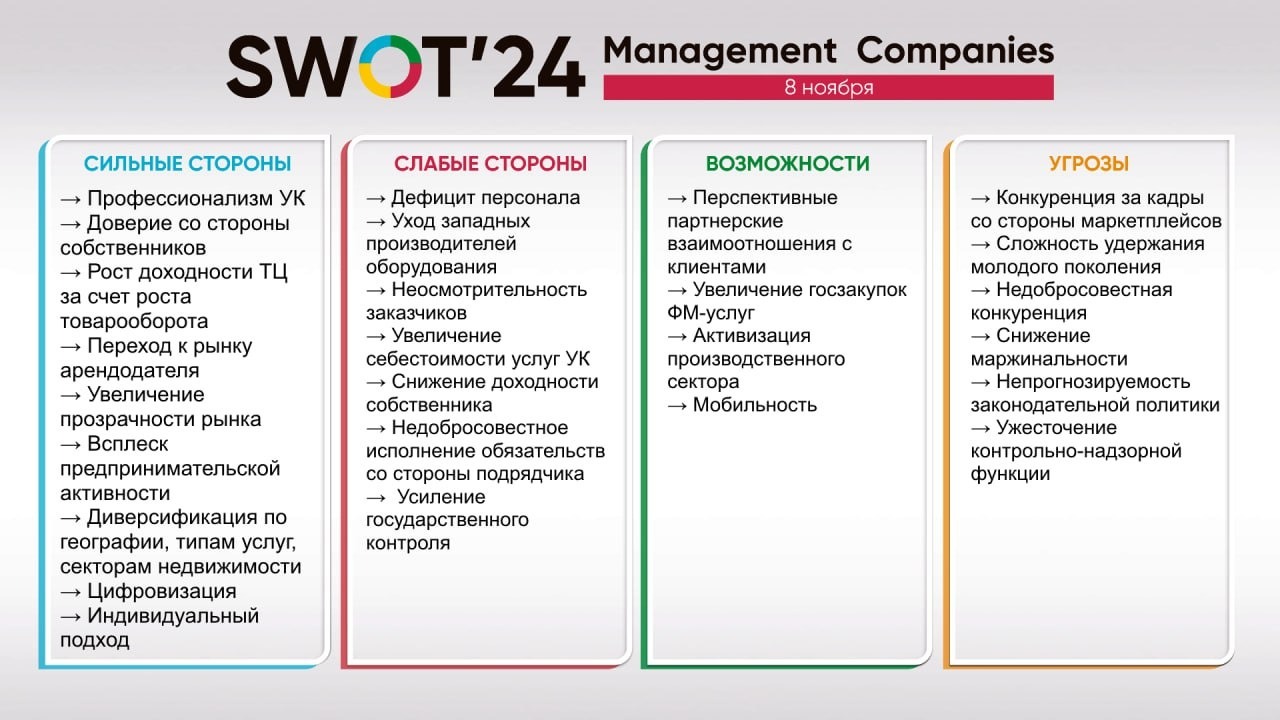 Несмотря на очевидные и неминуемые трудности, рынок управления коммерческой недвижимости продолжает развиваться и становиться все более профессиональным и технологичным. 2024 год едва ли станет революционным в этой сфере, но эксперты на SWOT’24 раскрыли многие возможности и точки роста. Как компании используют эти возможности и появятся ли на рынке новые вызовы – узнаем через год на SWOT’25!