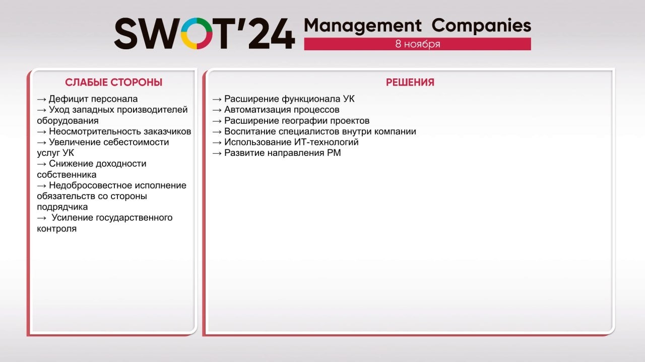 8 ноября в пространстве Multispace Павелецкая состоялась ежегодная практическая конференция для управляющих компаний в сфере коммерческой недвижимости SWOT’24 Management Companies.
