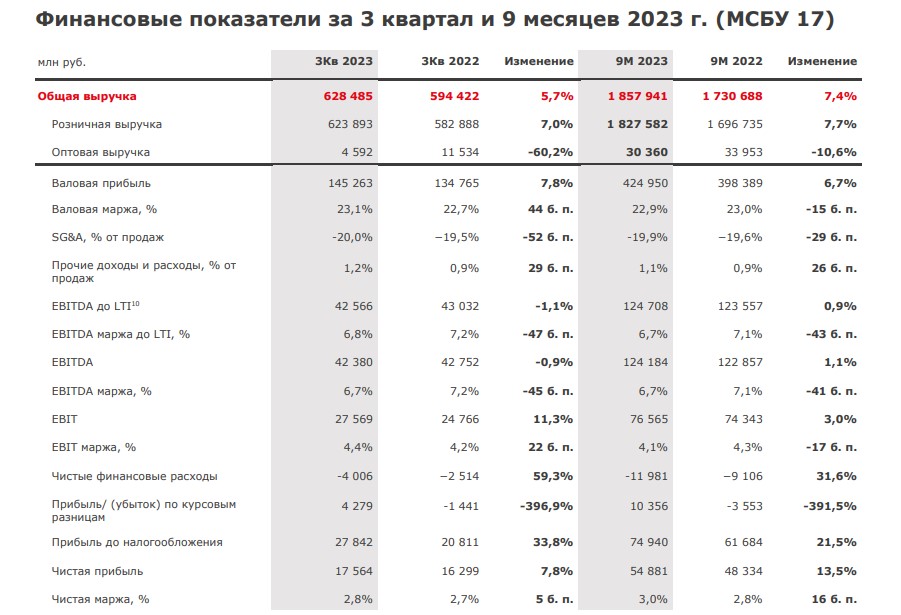 В 3 квартале 2023 г. общая выручка выросла на 5,7% год к году и составила 628,5 млрд руб. Чистая розничная выручка выросла на 7,0% год к году на фоне увеличения торговой площади на 5,8% и роста LFL продаж на 3,1%. Чистая розничная выручка магазинов под брендом «Магнит» увеличилась на 8,1% благодаря росту LFL продаж в зрелых магазинах и увеличению торговой площади.