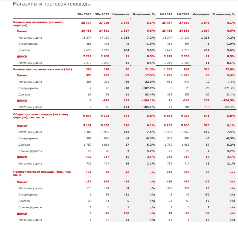 ? Компания открыла (gross) 440 магазинов (326 магазинов у дома «Магнит» и 15 магазинов у дома «Дикси», 98 магазинов дрогери и один супермаркет) или 398 магазинов (net). Общее количество магазинов сети по состоянию на 30 сентября 2023 г. составило 28 707;