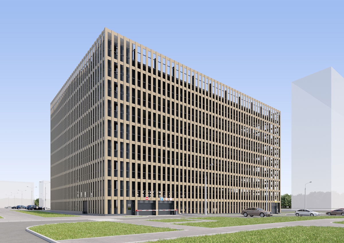 Здание имеет прямоугольную форму. Фасады планируется отделать глухими и перфорированными кассетами из оцинкованного стального листа, окрашенными в желто-серый и антрацитовый цвета. Для удобства и безопасности автомобилистов в паркинге предусмотрены лифт и эвакуационная лестница.