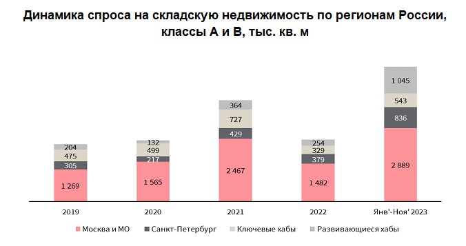 В Nikoliers активность на рынке также называют рекордной. По итогам 11 месяцев объем спроса уже на 10 тыс. кв. м превышает наибольшее годовое значение, наблюдаемое в 2021 году. Объем свободных помещений в Московском регионе опустился на самый низкий за последние 14 лет уровень – 95 тыс. кв. м. Объем заключенных BTS-сделок за 11 месяцев 2023 года уже превышает прошлогодний показатель в 3,6 раза.