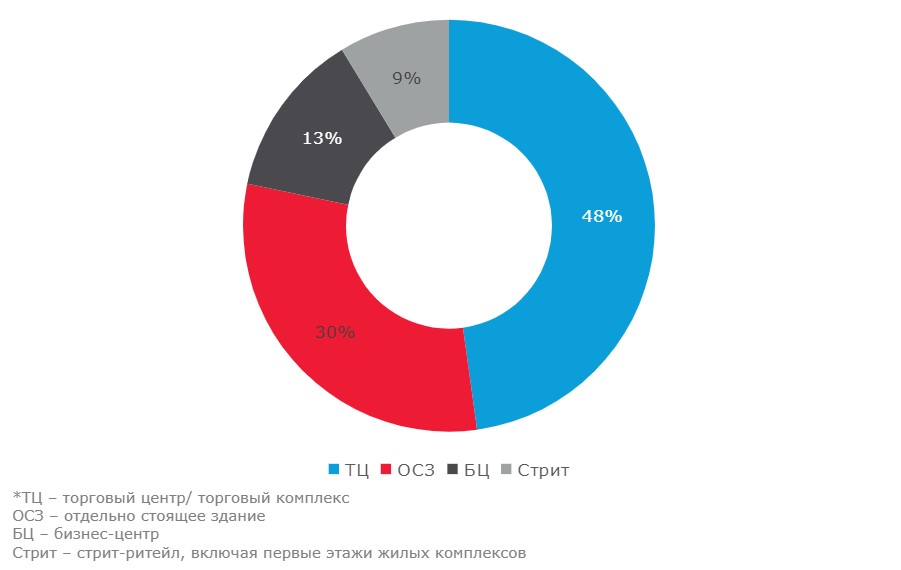 Структура действующих гастропространств в Москве по типу размещения, % от количества*