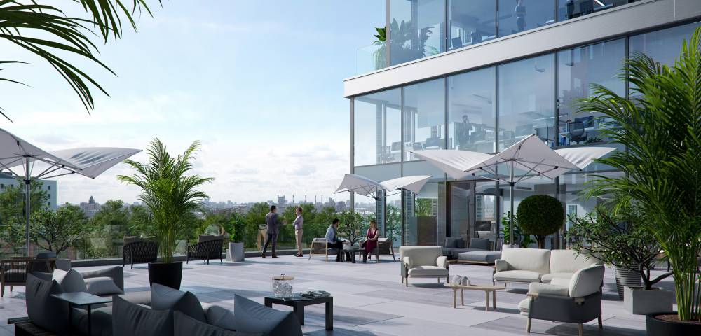 На территории бизнес-центра, доступной для всех желающих, будет создана комфортная безбарьерная среда. Появятся благоустроенные общественные зоны: газоны, пешеходные тротуары, летние веранды, парковки для самокатов и велосипедов.