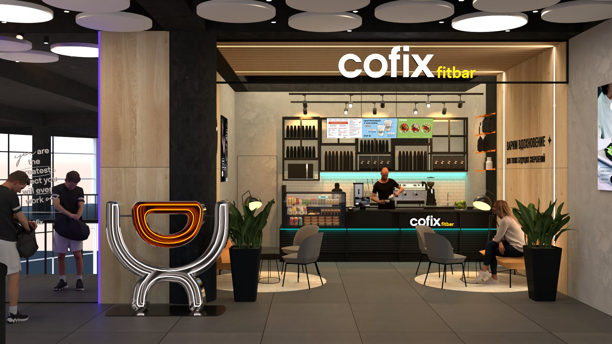 В Cofix fitbar наряду с обычными для Cofix позициями будут продаваться свежевыжатые соки, протеиновые коктейли, смузи, милкшейки, энергетики, предтрены и гейнеры. Категорию еды и перекусов пополнят батончики с протеином, а также новая линейка здоровых завтраков, салатов, сэндвичей и роллов. Точки Cofix fitbar будут размещаться рядом со входами в спортклубы и иметь две зоны выдачи, что позволит Cofix не ограничиваться трафиком спортклубов.