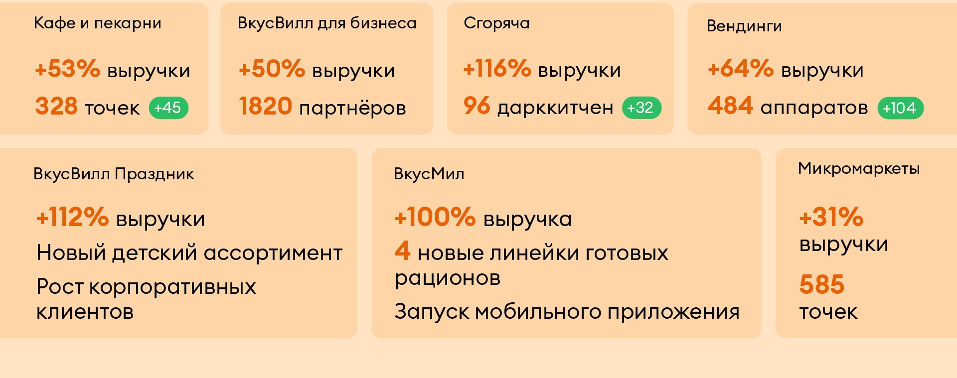 За пределами магазинов и доставки продолжает расширяться сеть вендингов с быстрым перекусом и микромаркетов с готовой едой, на конец 2023 года работает 482 вендинговых аппарата и 585 микромаркетов, прирост выручки составил 65 и 32% соответственно. Дополнительно ВкусМил предлагает готовые рационы, а ВкусВилл Праздник — кейтеринг с полезной едой и помощь в организации мероприятий, выручка обоих проектов выросла более чем в 2 раза за прошлый год. ВкусМил поменял фокус развития, вывел в ассортимент 4 новые линейки, предложил рынку уникальный семейный формат и запустил собственное мобильное приложение для удобства покупателей. ВкусВилл Праздник добился успехов в развитии детского ассортимента и в 3,5 раза увеличил долю заказов от юридических лиц, средний чек комплексных заказов кейтеринга и фуршетной еды вырос с 20 000 до 45 000 рублей.