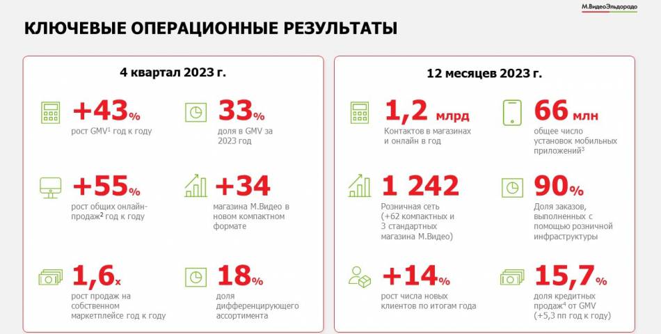 Сеть магазинов М.Видео и Эльдорадо на конец декабря 2023 года составила 1 242 магазина всех форматов (+34 новых магазина в четвёртом квартале) в более чем 370 городах России. В течение 2023 года компания открыла 62 магазина М.Видео в новом эффективном компактном формате и планирует его дальнейшее масштабирование в ключевых регионах. Согласно промежуточным итогам уже открытые магазины нового формата демонстрируют лучшие показатели по товарообороту, чем было изначально запланировано. В 2024 году ожидается открытие не менее 100 магазинов М.Видео, преимущественно компактного формата.