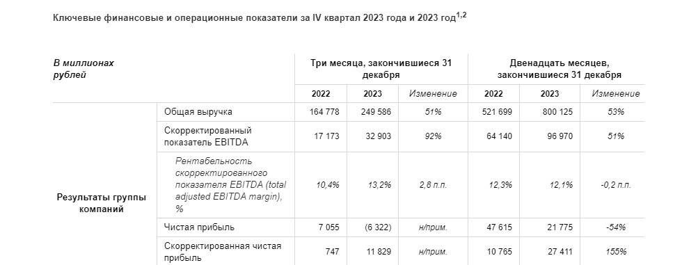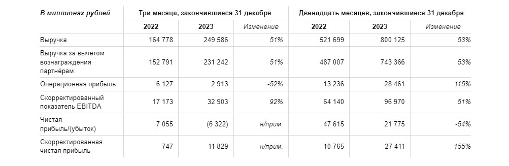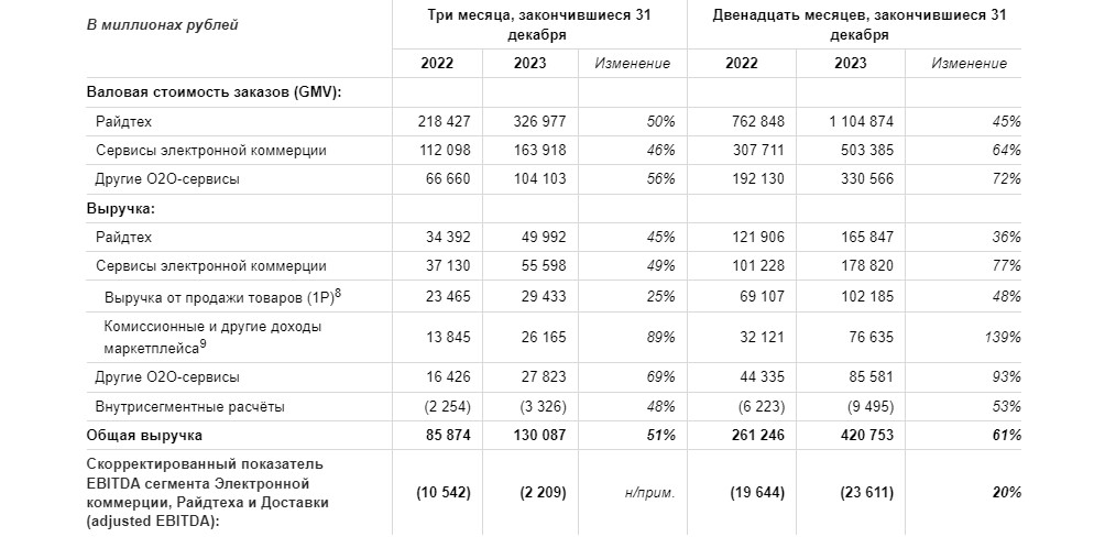 Общая выручка группы в 2023 году достигла 800 млрд рублей. Оборот в сегменте электронной коммерции - более 500 млрд. Убыток по скорректированному показателю EBITDA сегмента Электронной коммерции, Райдтеха и Доставки в четвёртом квартале 2023 года составил около 2,2 млрд рублей, тогда как в четвёртом квартале 2022 года аналогичный убыток составлял 10,5 млрд.