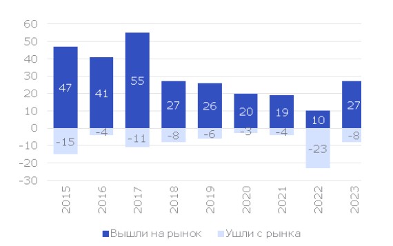 Динамика выхода и ухода с российского рынка международных брендов, штук, 2015?2023 гг.
