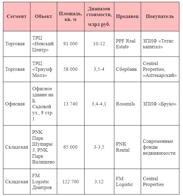 Топ-5 крупнейших сделок 2023 года с объектами недвижимости для внесения в ЗПИФ