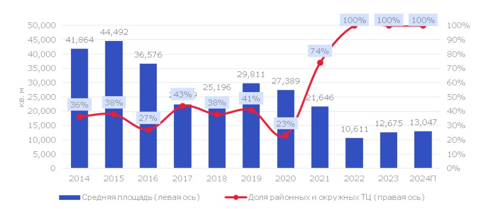 Средняя площадь вводимых торговых центров, 2014–2024П гг.