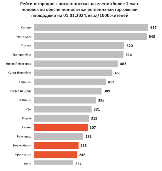 качественными торговыми центрами перешли в разряд аутсайдеров. Так что сегодня и Казань, и Новосибирск снова являются наиболее привлекательными для нового девелопмента в сфере торговой недвижимости (в группе аналогичных по численности населения городов).Кроме того, к потенциально интересным городам можно отнести Красноярск – это один из самых быстрорастущих миллионников, в котором исторически вводилось немного новых качественных торговых центров.