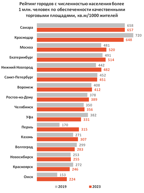 Существует и ряд крупных региональных центров (например, Казань, Новосибирск), в которых наиболее активный девелопмент на рынке торговой недвижимости наблюдался уже достаточно давно (в 2000-х годах, и отчасти – в 2010-х). Потом развитие в этом сегменте практически прекратилось или существенно замедлилось, и города из лидеров по насыщенности рынка