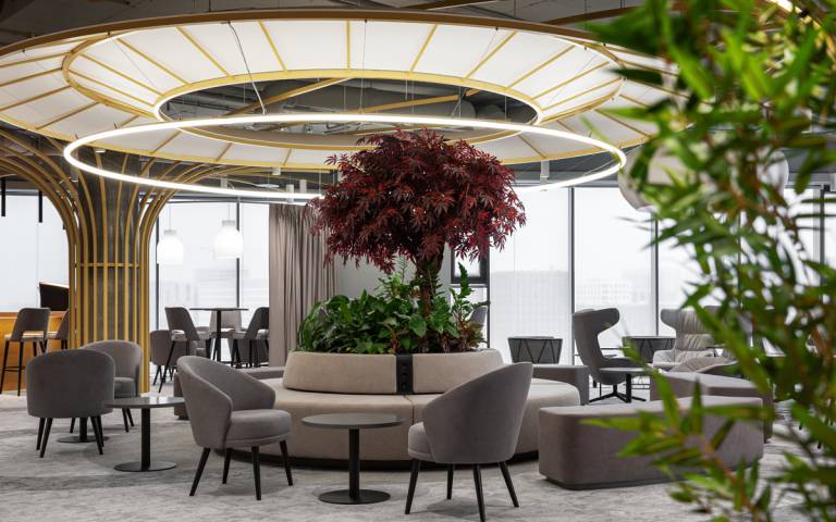 Венчает структуру офиса лаунж-зона, обладающая лучшими видами на Москва-реку и панорамы столицы. Лаунж является главной точкой притяжения и лицом проекта, может использоваться для отдыха, проведения переговоров и в качестве зрительного зала, сценой для которого служит Board-room . Кроме того, внутри спланирована полноценная кофейня. В лаунже спроектированы зоны с живым озеленением.
