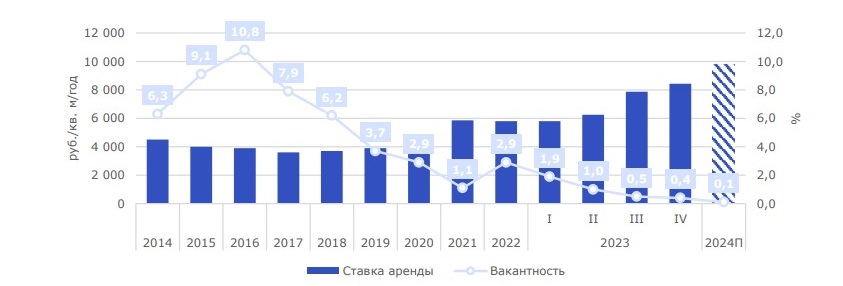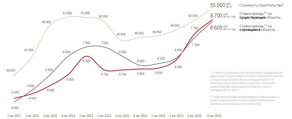 Во-первых, с ростом и стоимости строительства (по данным на декабрь 2023 года + 19% г/г), и с увеличением затрат на обслуживание складов, поскольку чем новее склад, тем выше налоговая часть в структуре операционных расходов (снова же, ввиду роста стоимости строительства).