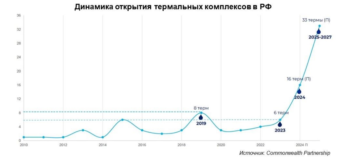 По прогнозам Commonwealth Partnership (CMWP), к концу 2027 года терм в России может стать в два раза больше. Несмотря на снижение активности по открытию новых термальных комплексов в 2020-2022 гг., по итогам 2023 года операторы приблизились к докризисным количественным показателям запуска новых объектов, и они продолжат расти.