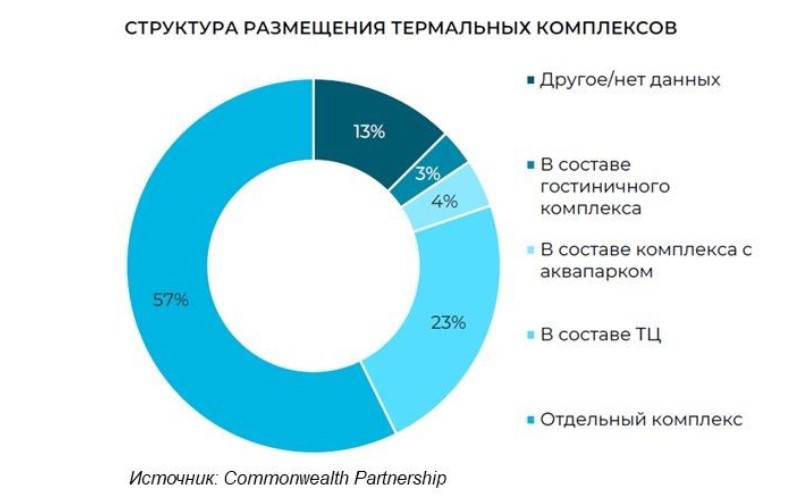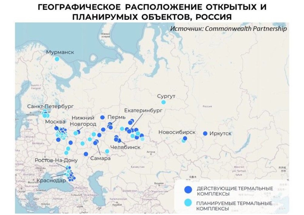 Основной термальной локацией остается Центральный федеральный округ. Среди городов, где концентрация термальных комплексов наиболее высока, – Москва, Краснодар, Ростов-на-Дону, Санкт-Петербург, Челябинск, Пермь, Екатеринбург, Нижний Новгород и Самара.