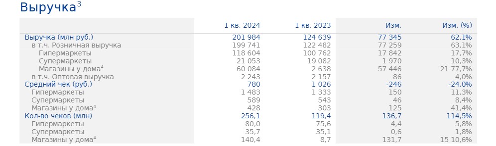 В первом квартале 2024 года, в основном благодаря приобретению «Монетки» и росту трафика в форматах «Гипермаркеты» и «Супермаркеты», количество чеков увеличилось на 114,5%, в то время как средний чек снизился на 24,0%, что, в основном, произошло в результате значительного увеличения доли магазинов у дома в общих розничных продажах.