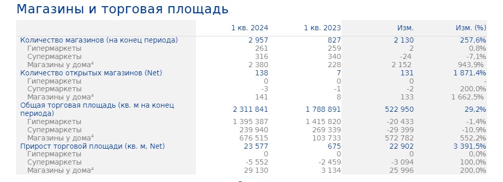 В результате приобретения торговой сети «Монетка» доля формата «Магазины у дома» достигла 30,1% от общей розничной выручки. В первом квартале 2024 года чистый прирост количества магазинов у дома составил 141 магазин. В отчётном периоде сопоставимые продажи формата «Магазин у дома» (включая результаты магазинов «Монетка» и «Мини Лента») выросли на 14,0% на фоне роста LFL-среднего чека на 12,4% и роста LFL-трафика на 1,4%.