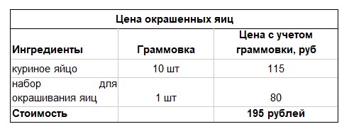 Специалисты онлайн-сервиса рассчитали индекс приготовления пасхальных блюд. Стоимость домашнего кулича с изюмом и глазурью среднего размера составит 183 рубля, творожной пасхи с цукатами — 534 рубля, а окрашеннные яйца — 195 рублей. Такой вариант сервировки стола обойдется в 912 рублей. Также можно подать мясное блюдо. Например, жаркое на 6 порций обойдется в 316 рублей.