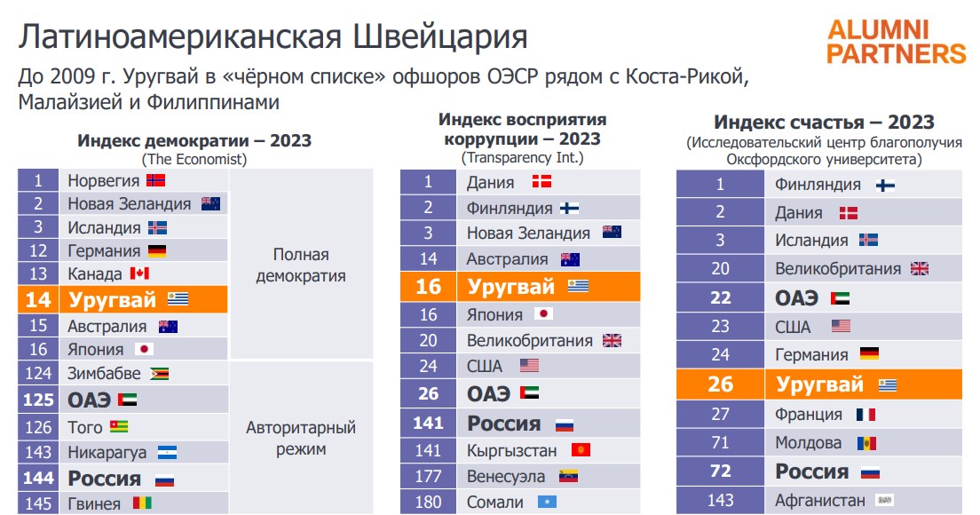 В свою очередь, Латинская Америка и Африка пока остаются для наших соотечественников terra incognita, за отдельными яркими исключениями, считает Алексей Федоров. «Например, Уругвай, – рассказывает Виталий Можаровский, партнёр, ALUMNI Partners. – По-швейцарски консервативно, по-средиземноморски спокойно, провинциально неспешно и немного винтажно. Если вам нужно срочное решение возникшей бизнес-проблемы или проведение платежа в "пожарном режиме" – то это точно не Уругвай. С комплаенсом здесь всё в полном порядке, коррупция - даже не думайте об этом. Видимо, сказывается очень нехарактерный для Латинской Америки этнический состав: больше 90% населения – потомки европейцев, а аборигены и потомки африканцев в силу исторических причин практически отсутствуют. В глубокой провинции, у аргентинской границы, есть даже маленькая колония русских староверов Сан-Хавьер, эмигрировавших в Уругвай больше века назад. Национальная экономика, как и сама страна, компактна, поэтому крупные успешные бизнесы ориентированы на экспорт: прекрасная говядина, достойное вино, первоклассная целлюлоза, профессиональные IT услуги и решения, сезонный туризм».