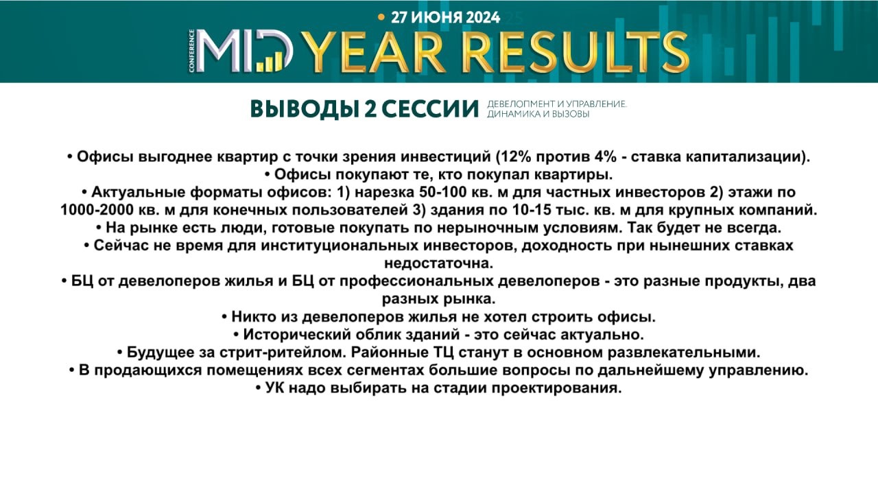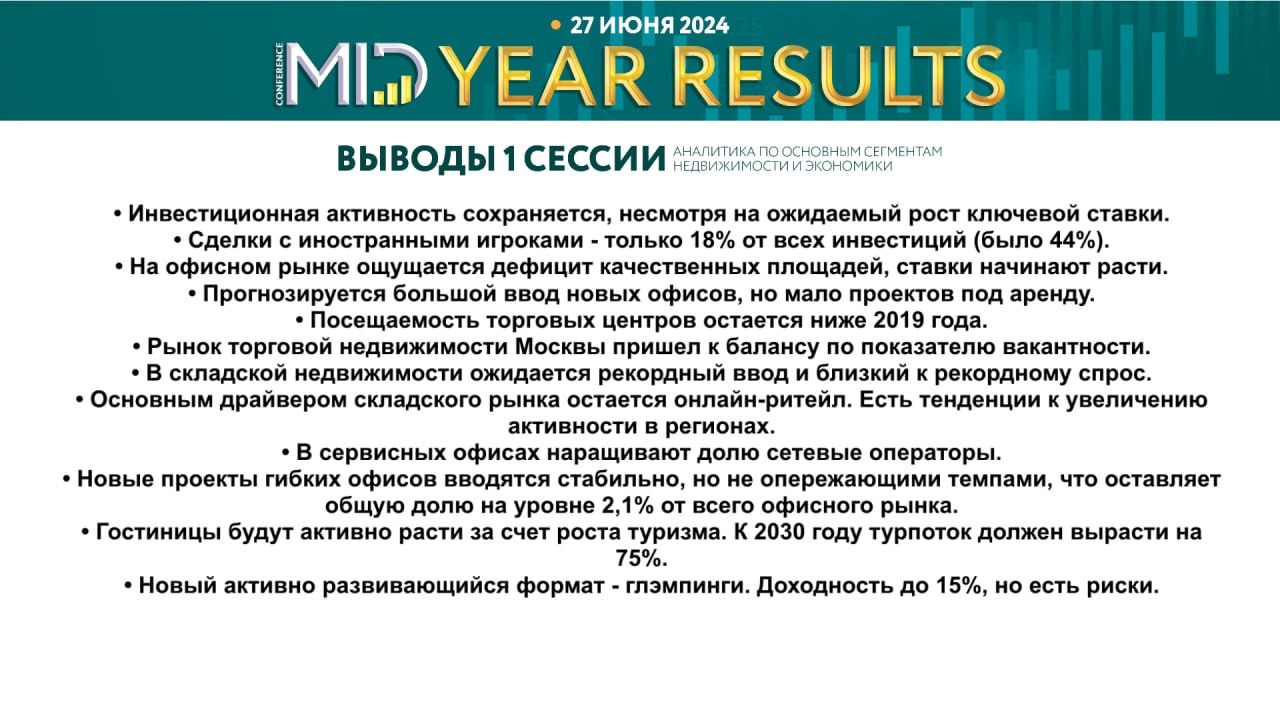 В Radisson Blu Leninsky в Москве состоялось традиционное ежегодное мероприятие Mid Year Results, посвященное итогам первой половины 2024 года. В первой сессии эксперты сделали аналитический срез по каждому из сегментов и поделились мыслями о перспективах на будущее, а во второй сессии сосредоточились на конкретных бизнес-моделях, вызовах и тенденциях в девелопменте и управлении объектами недвижимости.