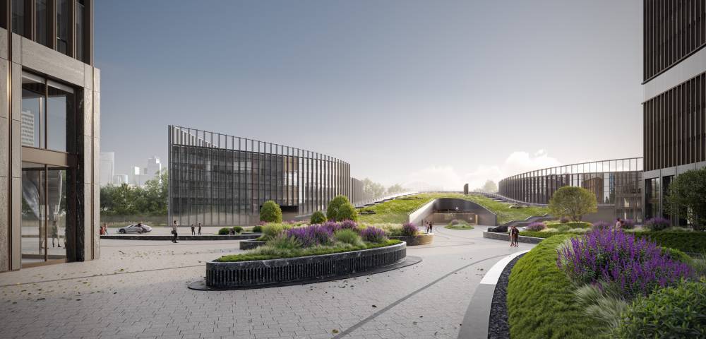 В состав проекта войдут три разноэтажные офисные башни. Первые этажи отведут под инфраструктуру: здесь появятся кафе и рестораны с выходом в парк, магазины и столовая, а также просторная бизнес-гостиная и фитнес-студия.