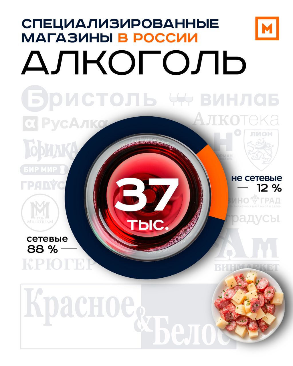 С августа 2023 г. количество алкомаркетов в России выросло на 24,3%, или на 5050 точек. По оценкам «Магазина Магазинов», всего в стране насчитывается более 37 тыс. алкомаркетов и пивных магазинов; в Санкт-Петербурге – 1,8 тыс. алкомаркетов, в Москве 2,2 тыс. Доля несетевых алкомаркетов в России достигает 12%, однако в Москве она заметно выше – 25%. Крупнейшим игроком остается сеть «Красное & Белое», на втором месте – «Бристоль». Другие заметные в Москве и Петербурге специализированные сети – «Ароматный мир», «ВинЛаб», «Отдохни», «Норманн» и «Градусы».