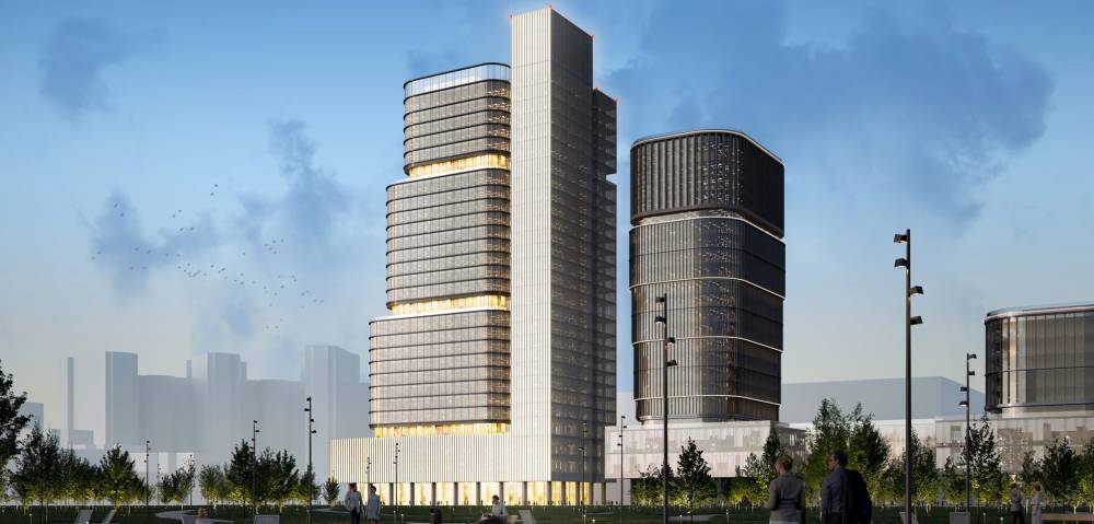 «Максимальная высотная отметка офисной башни составит 150 метров, что позволит объекту стать одной из новых архитектурных доминант района. Основной объем офисов будет представлен тремя ступенчатыми блоками, опоясанными стеклянными этажами с террасами. Фасады в этих объемах имеют плотный графический рисунок, созданный сочетанием панорамного остекления и ламелей», – рассказал главный архитектор Москвы Сергей Кузнецов.