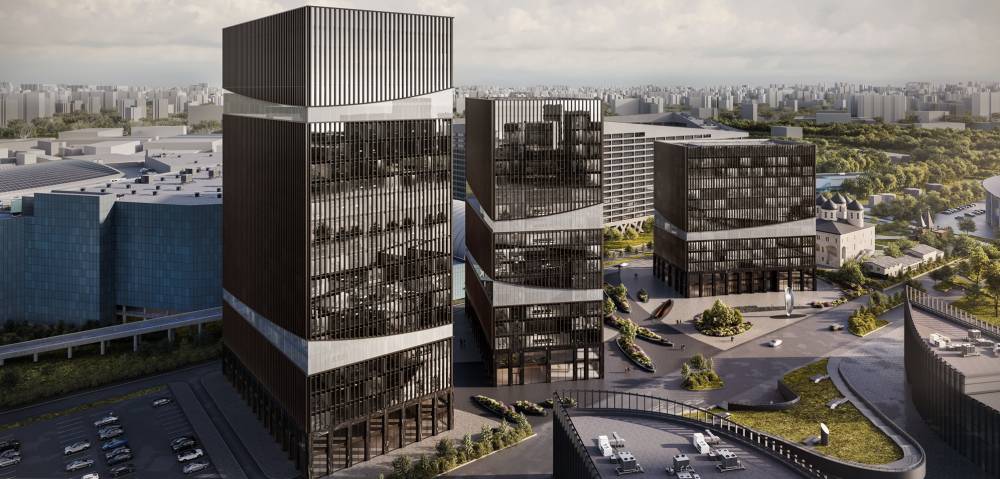 Основание трех офисных башен выполнят с облицовкой из натурального камня. В каждой из них предусмотрено лобби, где разместятся ресепшен, зоны ожидания и отдыха. Первые этажи отведут под инфраструктуру: здесь появятся кафе и рестораны с выходом в парк, магазины и столовая, а также бизнес-гостиная и фитнес-студия.