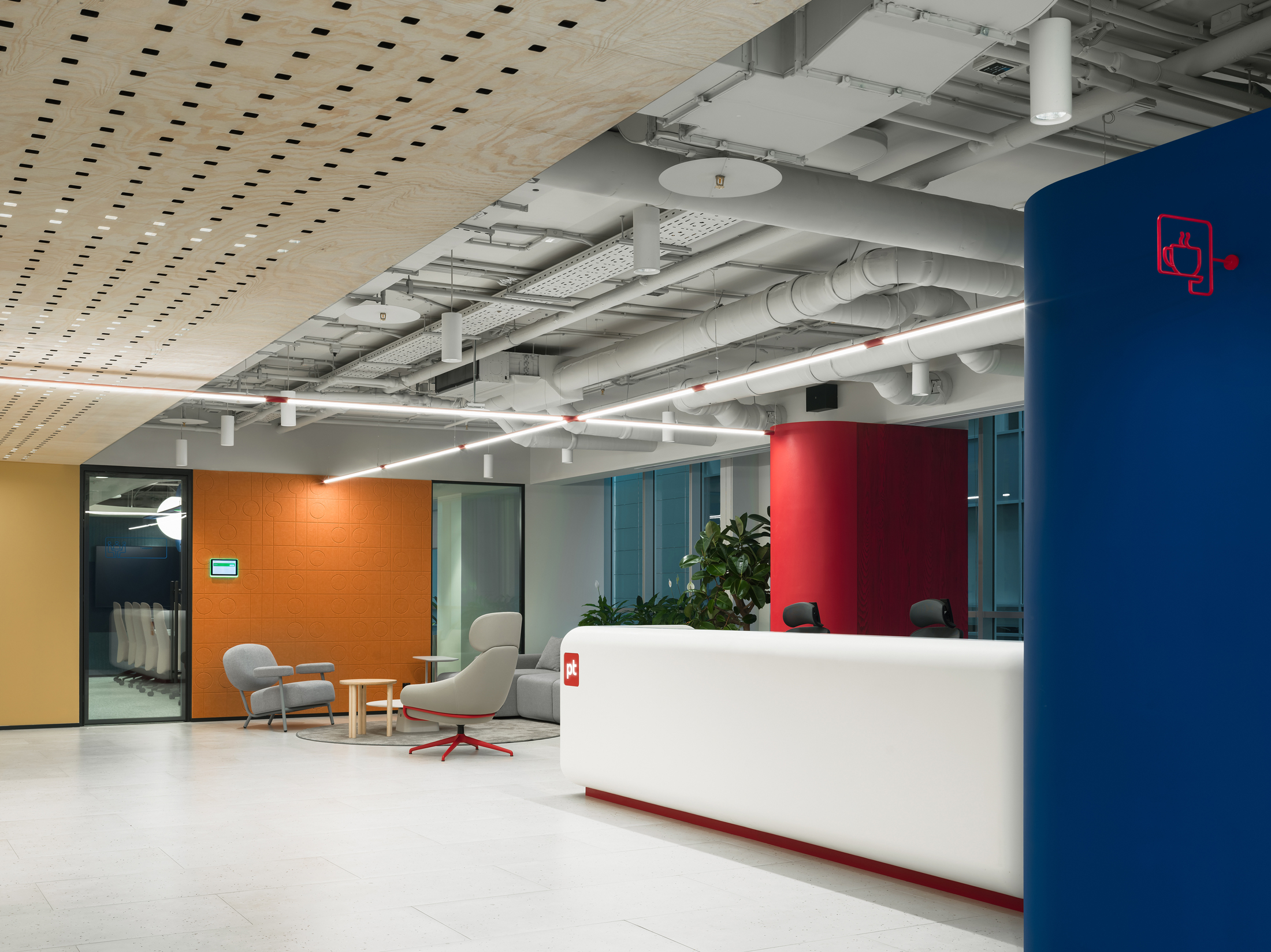 При разработке концепции дизайнеры Mors Architects взяли за основу стиль «Кассетный футуризм»: вымышленный аналоговый мир вне времени, отсылающий к ретрофутуризму в деталях. Цветовую гамму офиса сформировали яркие оттенки, присущие культовым элементам промышленного дизайна: насыщенный синий, глубокий красный, зеленый и оранжевый. Смысловая концепция пространства выстроена на ценностях компании, среди которых – развитие острого и быстрого мышления сотрудников. Поэтому паттерны в дизайне сформировались по принципу «головоломки»: архитекторы использовали объемные элементы стилизованных интеллектуальных игр для оформления.