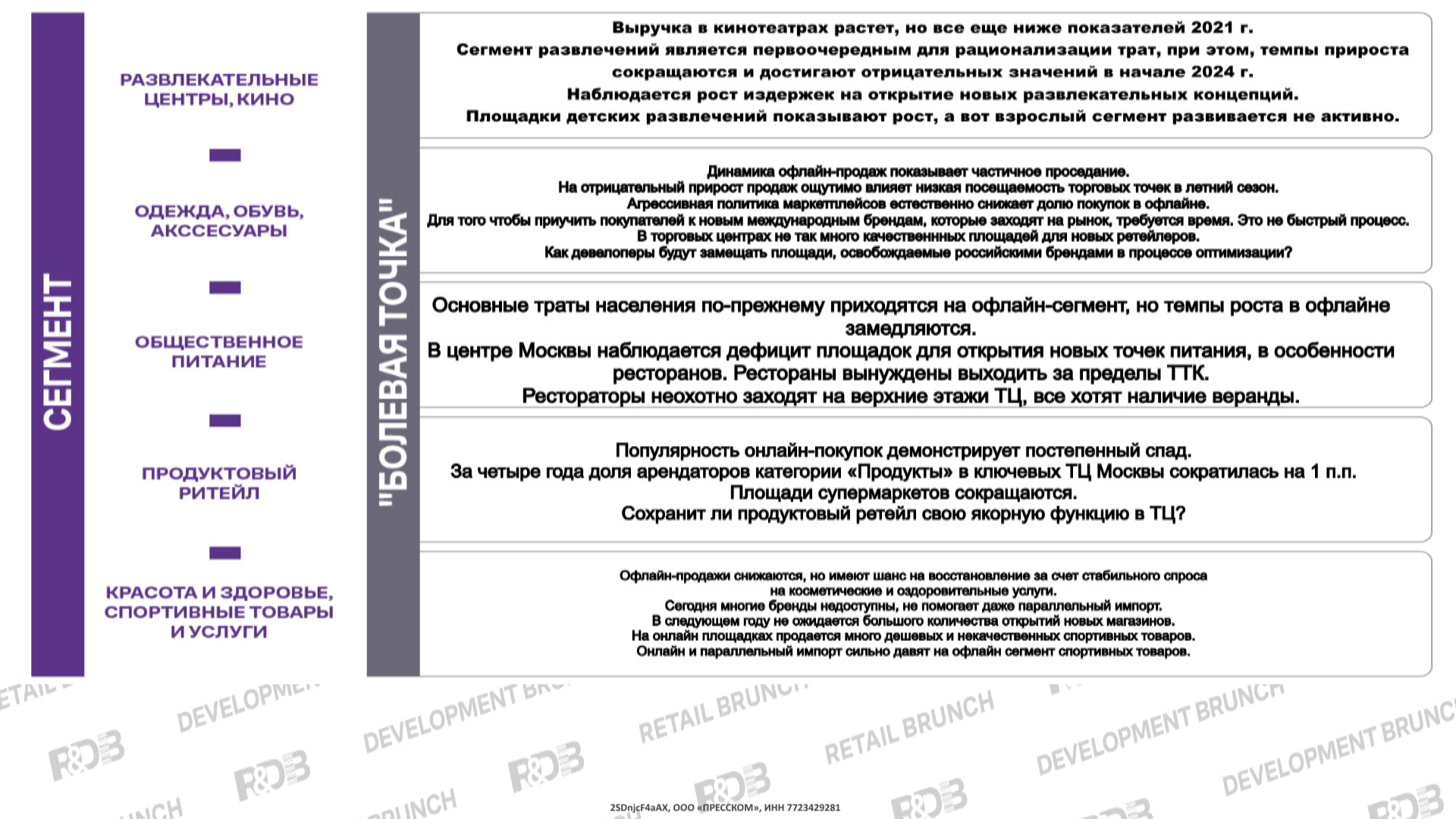 Вызовы: Недостаток качественных помещений под крупные бренды из Китая, которые будут выходить на российский рынок. При этом процесс выхода не быстрый, а оптимизация площадей российскими брендами ожидается уже сейчас. Так что торговым центрам придется определяться со стратегией использования помещений.