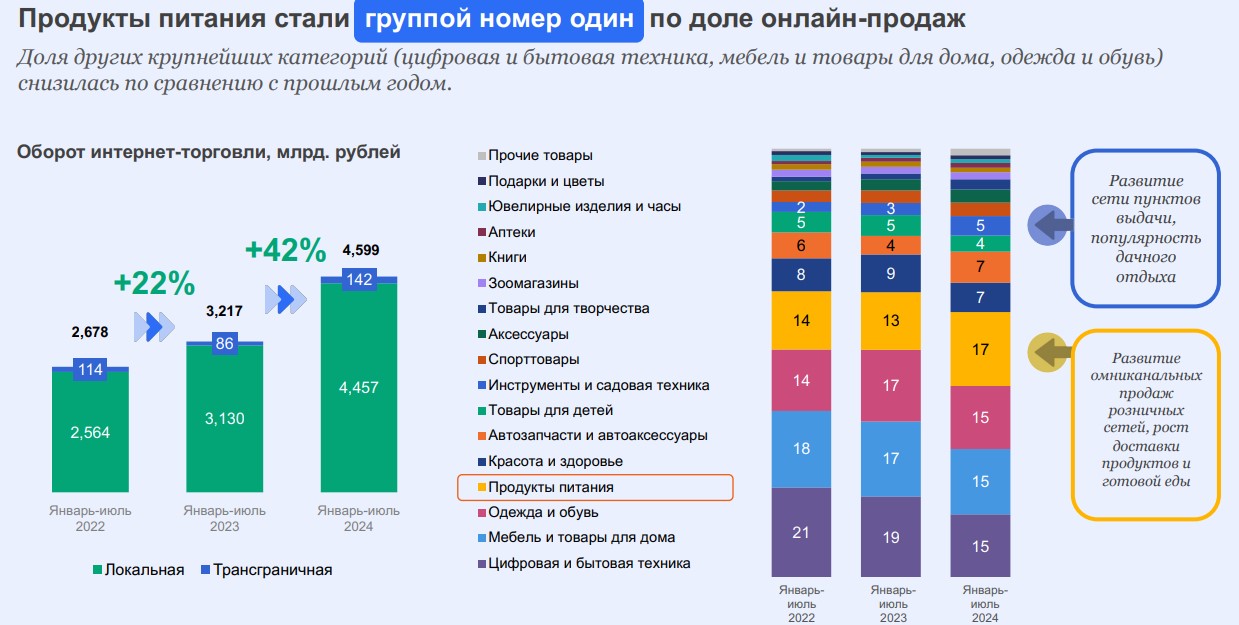 - В сегменте продуктов питания рост онлайн-продаж составляет 15% против 2% – в традиционном ритейле, но при этом доля e-commerce остается небольшой, достигая примерно 10% от общего оборота.