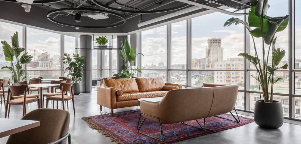 Офисные пространства двух этажей включают в себя закреплённые рабочие места, лаунж-зоны, коворкинги, телефонные будки и просторные столовые с панорамными окнами, из которых открывается захватывающий вид на реку и старый центр.