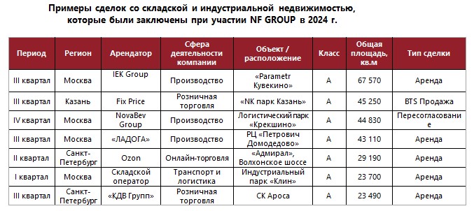 Алексей Новиков, управляющий партнер NF Group: «2024 год вновь подтвердил значительный потенциал складской и индустриальной недвижимости. Несмотря на непростые рыночные условия, команда складского департамента NF Group не только поддерживала высокий уровень деловой активности, но и задавала направление для развития всего рынка, что подтверждает наш стратегический подход и умение предугадывать тренды».