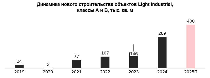 В прошлом году спрос со стороны инвесторов на покупку light industrial впервые превысил объемы ввода. По оценкам IBC Real Estate, объем ввода по итогам 2024 года в Московском регионе составил 289 тыс. кв. м, что на 98% превысило аналогичное значение 2023 года, и стало историческим максимумом в сегменте. Показатели нового строительства объектов light industrial достигнут 400 тыс. кв. м, и станут рекордными за весь период наблюдений.