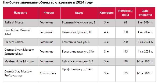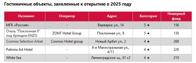 В 2025 году, по словам Ольги Широковой, к открытию заявлено шесть гостиничных объектов общим номерным фондом 998 номеров. В сегменте классических отелей – многофункциональный гостиничный комплекс «Россия» 5* на 156 номеров, Отель "Поклонная 9" 5* на 130 номеров (изначально гостиница должна была открыться под брендом SO/ Hotels & Resorts международного оператора Accor), Cosmos Selection Arbat 4* на 268 номеров, Palmira Art Hotel 4* на 226 номеров и White Sea 4* на 218 номеров. Значимый прирост в сегменте апарт-отелей не ожидается. «С учетом растущего турпотока и предпочтений туристов, перспективным направлением является строительство отелей категории 3–5 звезд, – считает Валерий Тумин, директор рынков России и СНГ fam Properties. – Планируется увеличить гостиничный фонд Москвы на 25,7 тыс. номеров к 2030 году.