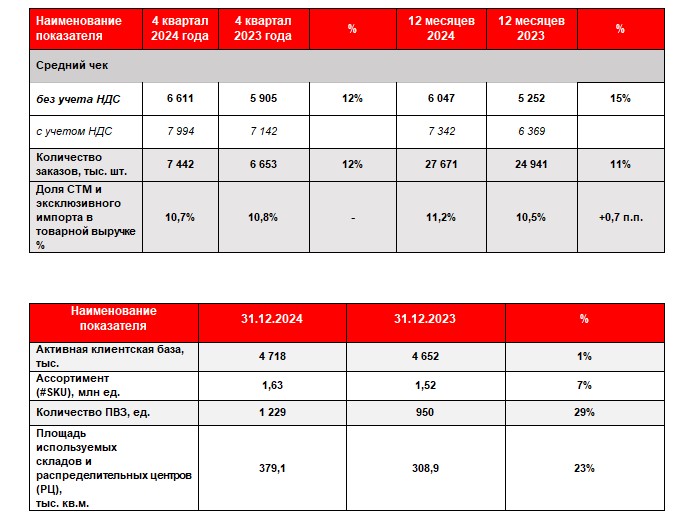 В 2024 году команда продолжила улучшение инфраструктуры, обеспечивающей высокий уровень сервиса и продукта - в частности, логистических мощностей и ассортимента. Результатом такой работы стало увеличение ПВЗ почти на треть, существенный рост площади используемых складов и логистических центров, а также увеличение ассортимента, доступного для наших клиентов.