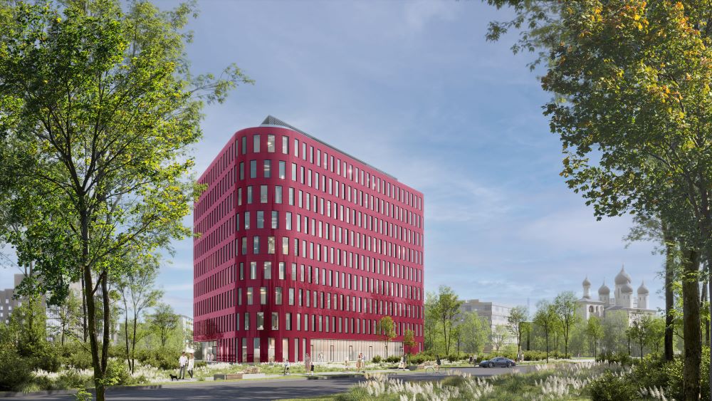 Бизнес-центр получил название Noon. Внешне он представляет собой десятиэтажное здание треугольной формы с мягкими закругленными углами. Внимание привлекает насыщенный малиновый цвет фасадов. В темное время предусмотрена архитектурная подсветка здания: вертикальные светильники расположат в районе оконных проемов и в зоне входных групп. Ограждения на кровле выполнят из алюминиевых ламелей. Первый этаж с южной и западной стороны остеклен и заглублен относительно основной плоскости фасада, благодаря чему образуются навесы над входными группами.
