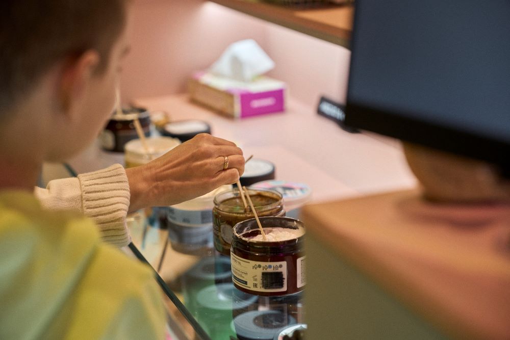 Специализированный магазин площадью 8 кв. м предлагает товарную матрицу, собранную из более 250 SKU под брендом «ВкусВилл». Продукция предназначена для ухода за лицом, губами, областью вокруг глаз, волосами, телом, руками и ногами, также представлена парфюмерия и ароматовары для дома. Порядка 98% ассортимента производится в России, также представлена линейка косметики из Кореи.