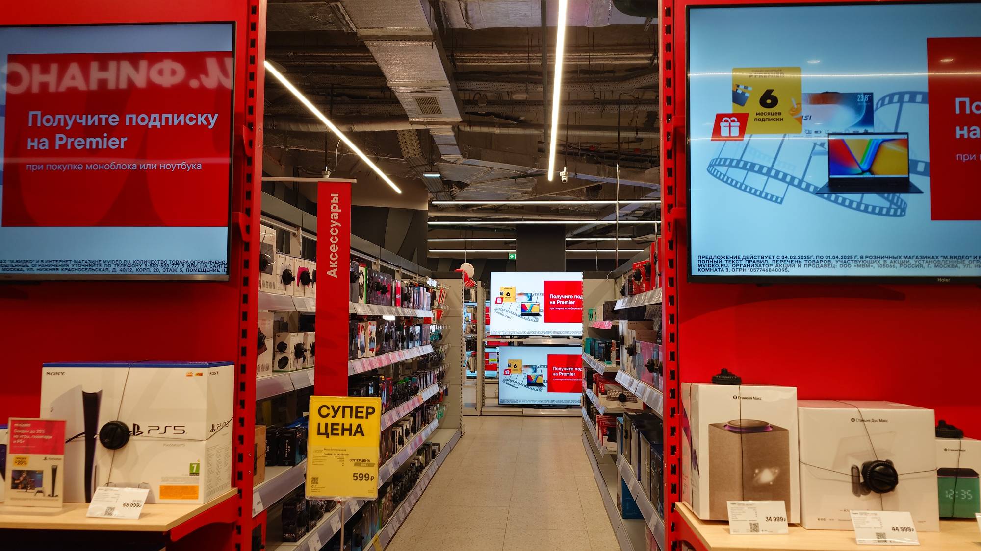 Помимо внедрения ИИ-консультанта, новый магазин в Botanica Mall отличается современным дизайном и удобным зонированием. Фирменный стиль «М.Видео» интегрирован в интерьер: узнаваемый красный цвет, динамичные элементы логотипа и функциональные торговые стеллажи. Фирменный паттерн в графитовом цвете над пристенными стеллажами по всему периметру магазина визуально добавляет объем.
