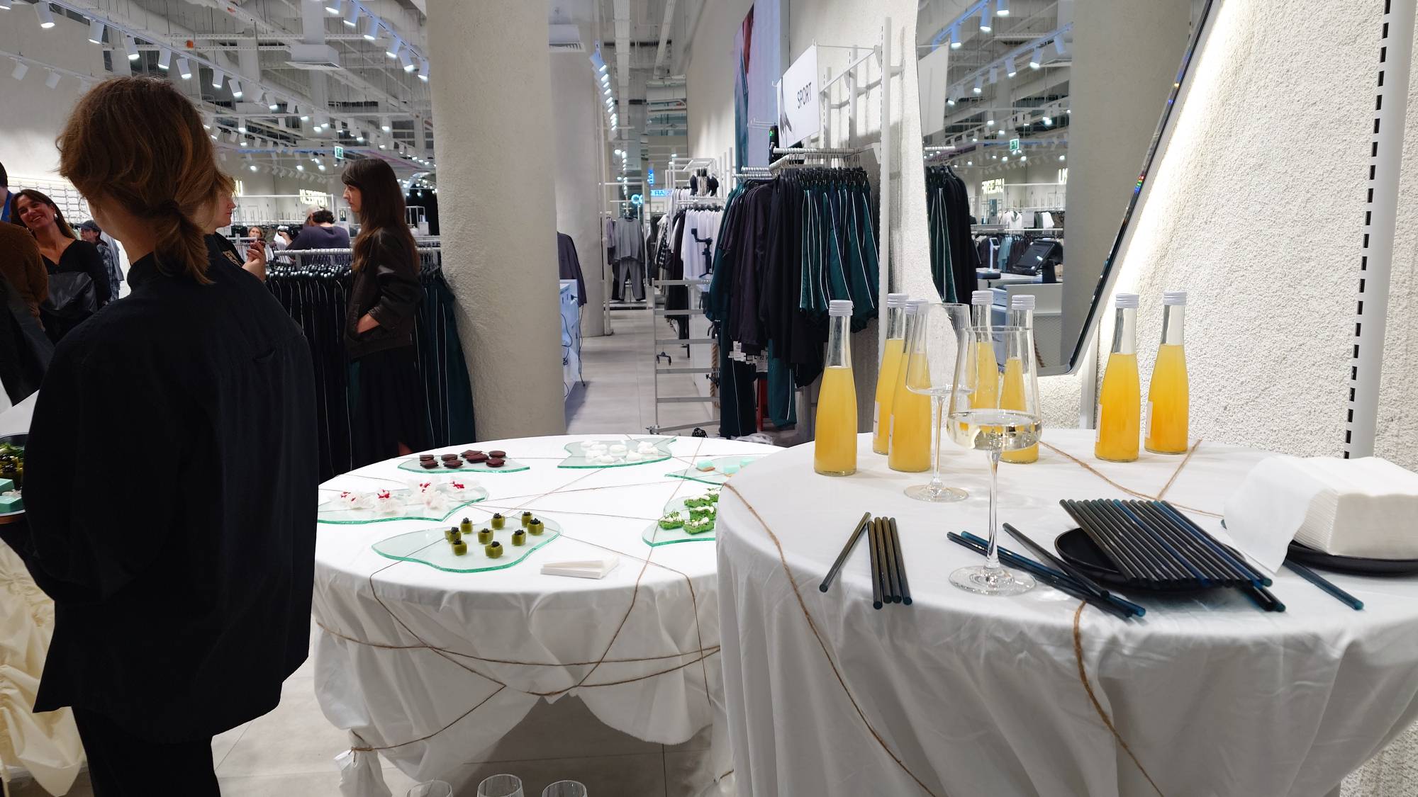Пространство дополняет бирюзовая надпись над эскалатором «Все немного разные». Это инсталляция художницы Алиной Глазун, с которой бренд выпускал совместную коллекцию, а также оформлял примерочные в петербургском флагмане в ТРЦ «Галерея».