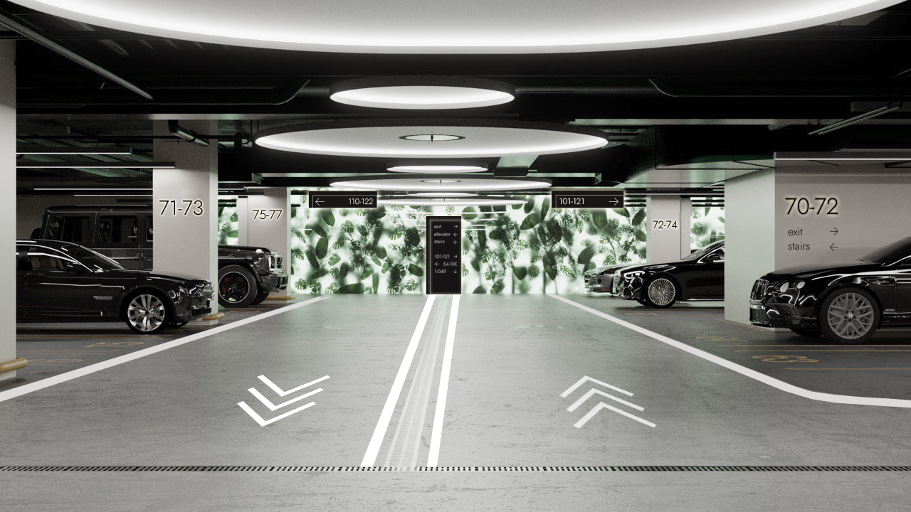 Доминирующим элементом интерьера стала масштабная фитостена с тропическими растениями и мягкой подсветкой, которая создает эффект глубины и объема, трансформируя бетонные стены в иллюзию живого, дышащего сада. Игра света и тени добавляет динамики статичному пространству, превращая парковку в арт-объект.