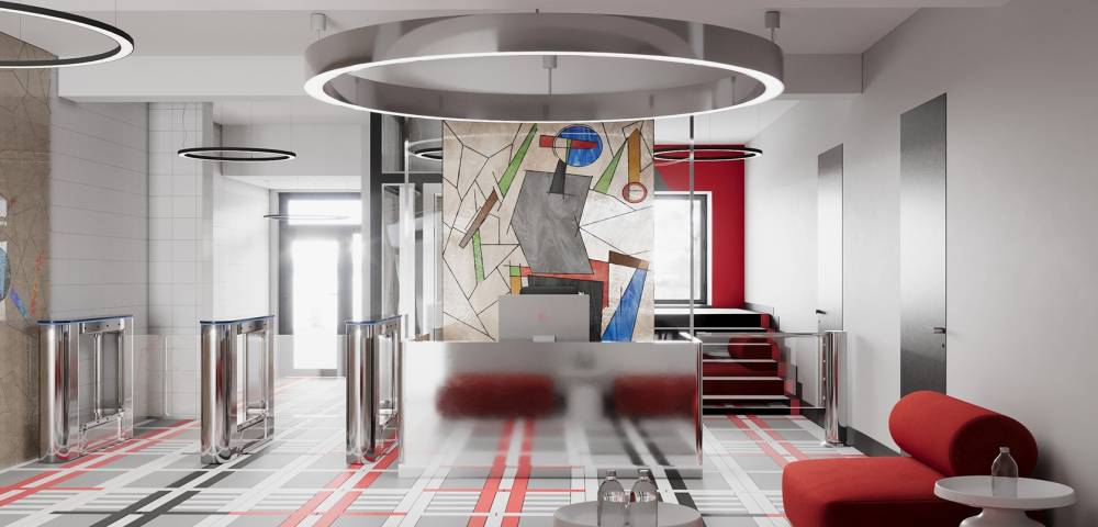 Создавая концепцию бизнес-центра для корпуса, в котором начались работы, архитекторы и дизайнеры West Wind Group вдохновлялись эстетикой русского авангарда, т.к. этот стиль гармонирует с «промышленной историей» района.