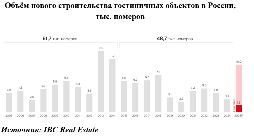 С 2019 года темпы строительства новых гостиниц демонстрировали снижение. В среднем в период с 2019 по 2024 год номерной фонд страны пополнялся на 3,5 тыс. номеров ежегодно. За этот период рынок столкнулся с рядом вызовов, поясняют в IBC Real Estate: снижением туристского потока в связи с пандемией, стремительным сокращением числа в Россию иностранных туристов после 2022 года, ростом стоимости строительства, эксплуатационных расходов и рабочей силы.