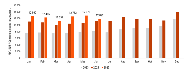 Помесячная средняя цена на номер (руб.) в отелях современного качества: 1 пол. 2025 г. ср. с 12 мес. 2023-24 гг.